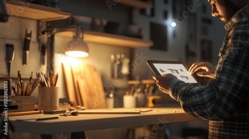 Craftsman Reviewing Furniture Designs on Tablet in Workshop