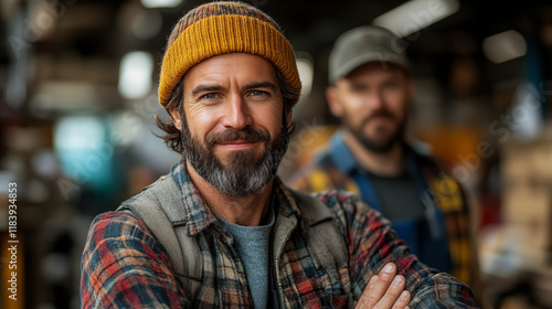 Craftsman smiling confidently in workshop environment, artisan portrait