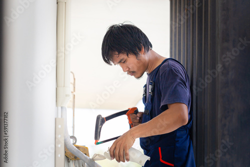 Craftsman worker sawing a pipe, Technician man installing an air conditioning in a client house, Young repairman fixing air conditioner unit, Maintenance and repairing concepts