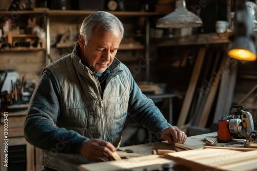 Craftsman working diligently in a cozy workshop during the late afternoon sunlight