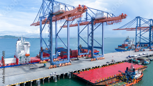 Crane loading box container to cargo ship at commercial dock port. Shipyard Cargo Container Sea Port Freight forwarding service logistics and transportation. International Shipping Customs Port..