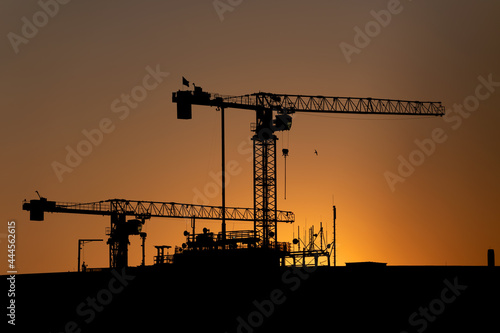 Cranes Silhouette Against Sunset Sky