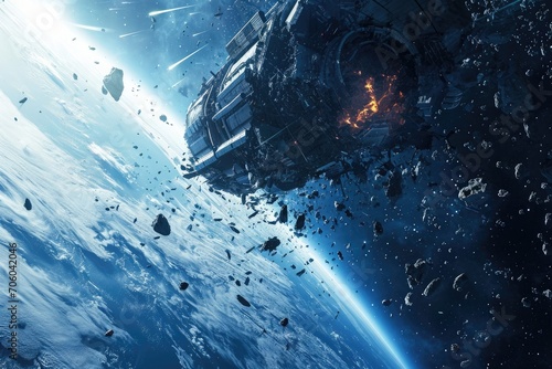 crashed into pieces space station with planet Earth background
