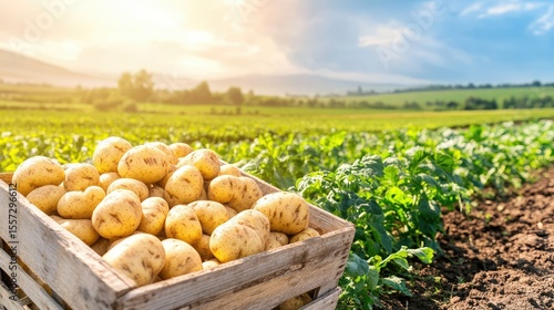 Crate brimming with young potatoes freshly pulled from the earth, with farmland stretching out behind
