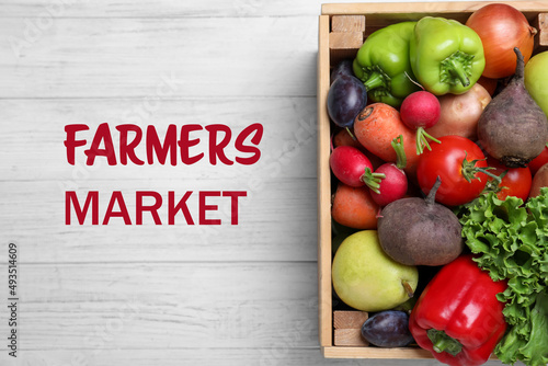 Crate of fresh vegetables on white wooden table, top view. Farmers market