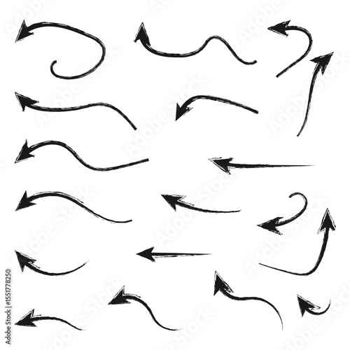 Crayon arrow sketches collection, hand drawn doodle style pointers, curved lines, round swirls. Chaotic scribbling, artistic design elements set.
