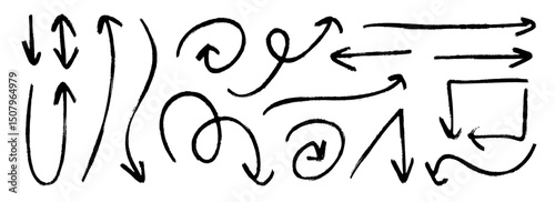 Crayon hand drawn arrow collection. Black curve, zig zag and straight doodle arrows set. Grungy charcoal sketch pointer or direction lines. Vector pastel pencil, chalk or marker brush stroke elements