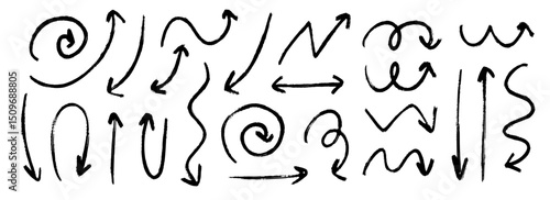 Crayon hand drawn arrow collection. Black wavy, zig zag and straight doodle arrows set. Grungy charcoal sketch pointer or direction lines. Vector pastel pencil, chalk or marker brush stroke elements