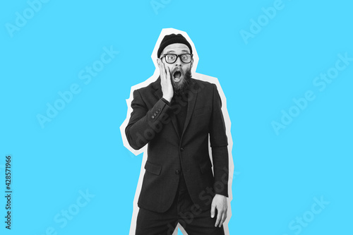 Crazy hipster guy emotions. Collage in magazine style. Flyer with trendy colors. Discount, season sales. Modern design, creative artwork