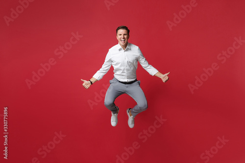 Crazy young business man in white shirt, gray pants posing isolated on bright red background studio portrait. Achievement career wealth business concept. Mock up copy space. Jumping showing thumbs up.