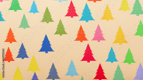Cream colored background with paper texture, colorful and stylized Christmas trees