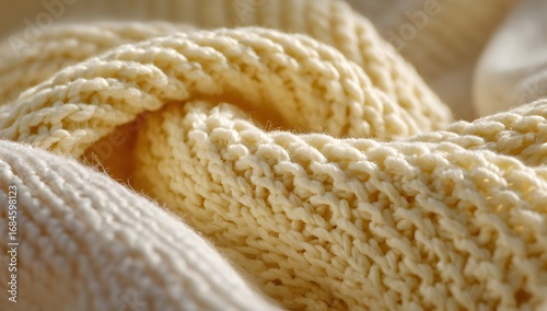 Cream colored knitted wool fabric texture with cable knit pattern creating cozy warm layered material closeup