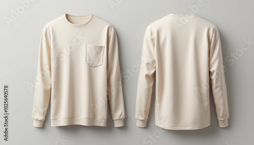 Cream Long-Sleeve Sweatshirt with Front Pocket, Displayed Front and Back