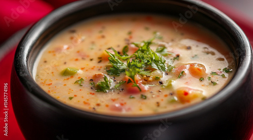 cream of soup with parsley, soup with meat and vegetables, soup, red background. Focus on soup.