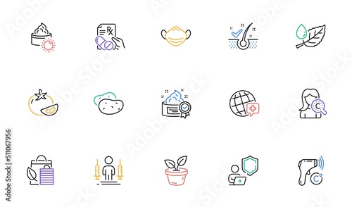 Cream, Potato and Electronic thermometer line icons for website, printing. Collection of Shield, Medical mask, Sun cream icons. Anti-dandruff flakes, Leaves, Collagen skin web elements. Vector