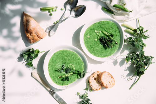 cream soup of green peas in a white plate on a white background