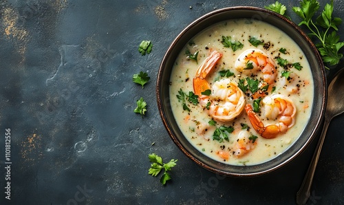 Cream soup with shrimps in a bowl on rustic background, view from above
