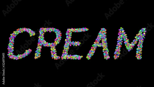 Cream written in 3D illustration by colorful small objects casting shadow on a black background