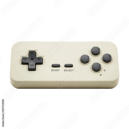 Cream-colored vintage video game controller, classic rectangular design, D-pad, action buttons, subtle wear, isolated on transparent background with copy space, nostalgia for retro gaming