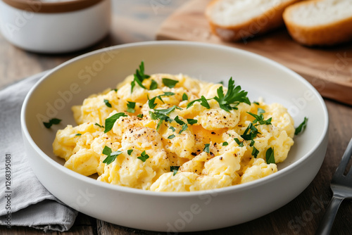 Creamy and fluffy scrambled eggs garnished with fresh parsley