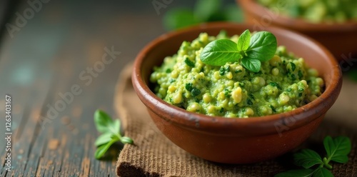 Creamy arugula pesto filling rustic terracotta bowl, vegetable, photography, culinary