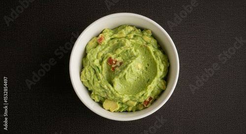 Creamy avocado dip in a white bowl, featuring diced tomatoes and herbs