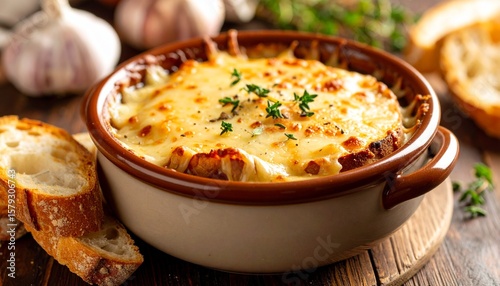 Creamy, cheesy French onion soup in a rustic bowl, garnished with thyme and toasted bread slices.
