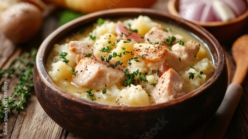Creamy chicken and potato soup garnished with fresh thyme in rustic wooden bowl