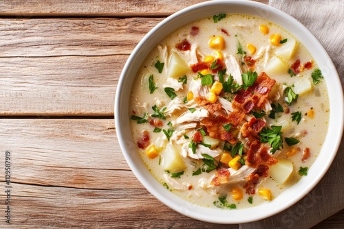 Creamy chicken corn chowder with shredded chicken potatoes and corn garnished with bacon and parsley served in a white bowl on a wooden table