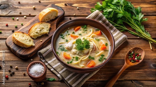 Creamy Chicken Noodle Soup with Bread and Herbs on Rustic Wooden Table
