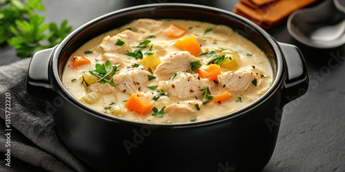 Creamy chicken stew with vegetables in black pot, garnished with herbs