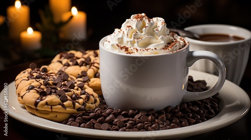 Creamy chocolate beverage sprinkled with chocolate chips.