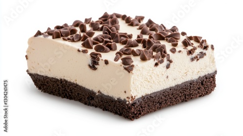 Creamy chocolate chip cheesecake slice resting on a pristine white background, highlighting its velvety texture and rich topping of decadent chocolate chips