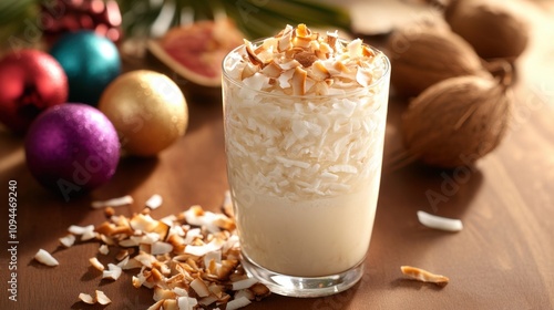 Creamy Coconut Beverage with Toasted Coconut Flakes Surrounded by Colorful Christmas Ornaments on a Wooden Table Top