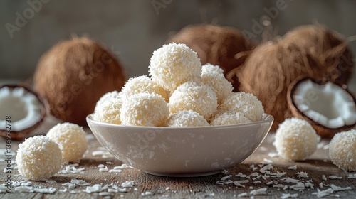Creamy coconut truffles in a bowl, surrounded by whole coconuts and shredded coconut