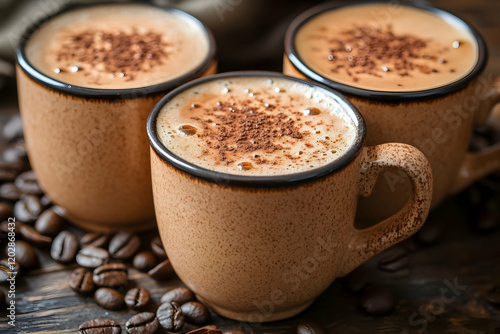 Creamy coffee cups, cocoa, beans, wood, breakfast