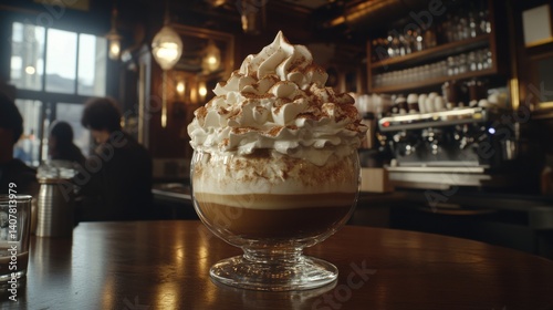 Creamy Coffee Dessert in Elegant Glass with Whipped Topping and Chocolate Shavings on Table in Cozy Cafe Atmosphere, Ideal for Food Lovers and Culinary Art Enthusiasts