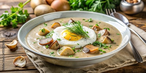 Creamy Czech mushroom soup with potatoes, topped with a poached egg and fresh dill, Czech, traditional, kulajda, soup