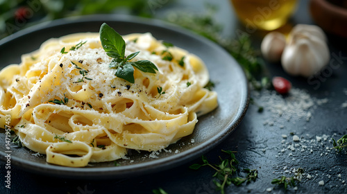 Creamy Fettuccine Pasta with Fresh Basil and Garlic on Plate