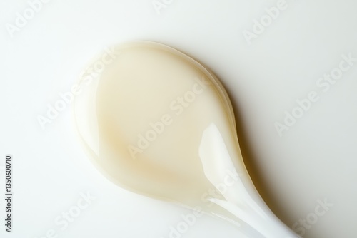 Creamy, light beige liquid, glossy texture, poured on a white spoon, close-up view.
