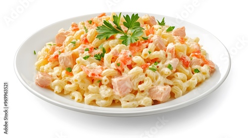 Creamy macaroni salad with ham and vegetables garnished with fresh parsley