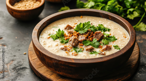 Creamy meat porridge with herbs and nuts in wooden bowl, garnished with fresh cilantro