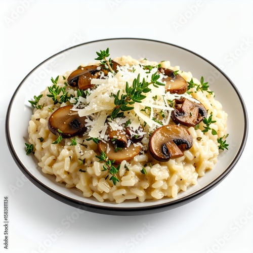 Creamy mushroom risotto topped with parmesan and herbs, served elegantly on white background