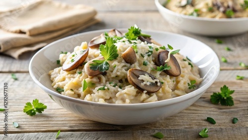 Creamy mushroom risotto topped with parsley and grated cheese in a shallow white bowl , white bowl, herbs
