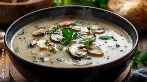 Creamy Mushroom Soup Garnished with Fresh Herbs in a Serving Bowl