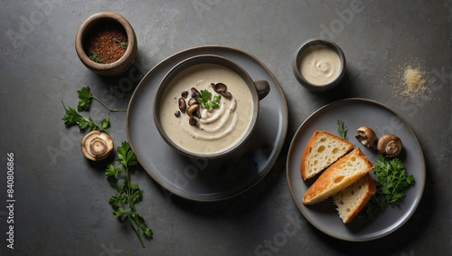 Creamy mushroom soup with mushrooms in a bowl.