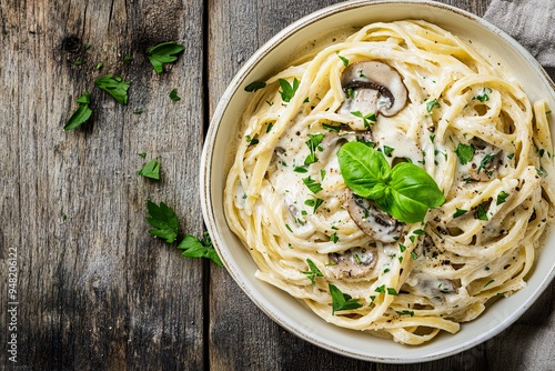 Creamy pasta with mushrooms and herbs in a bowl, served on a rustic wooden table.