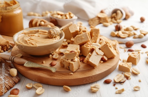 Creamy peanut butter and nut fudge pieces on wooden board with peanuts and honey on bright kitchen countertop, delicious dessert composition for food photography