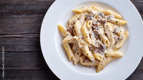 Creamy Penne Pasta. Top View of Italian Penne alla Norcina with Cream Sauce, Black Truffle, and Cheese on White Plate