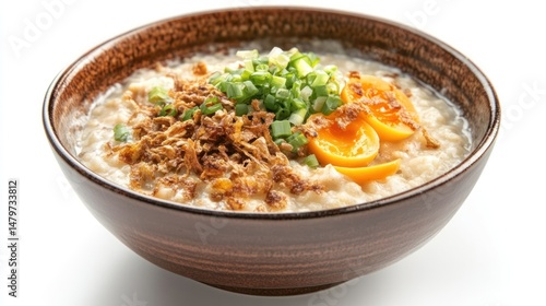 Creamy porridge topped with crispy fried shallots, sliced scallions, and a halved salted egg yolk